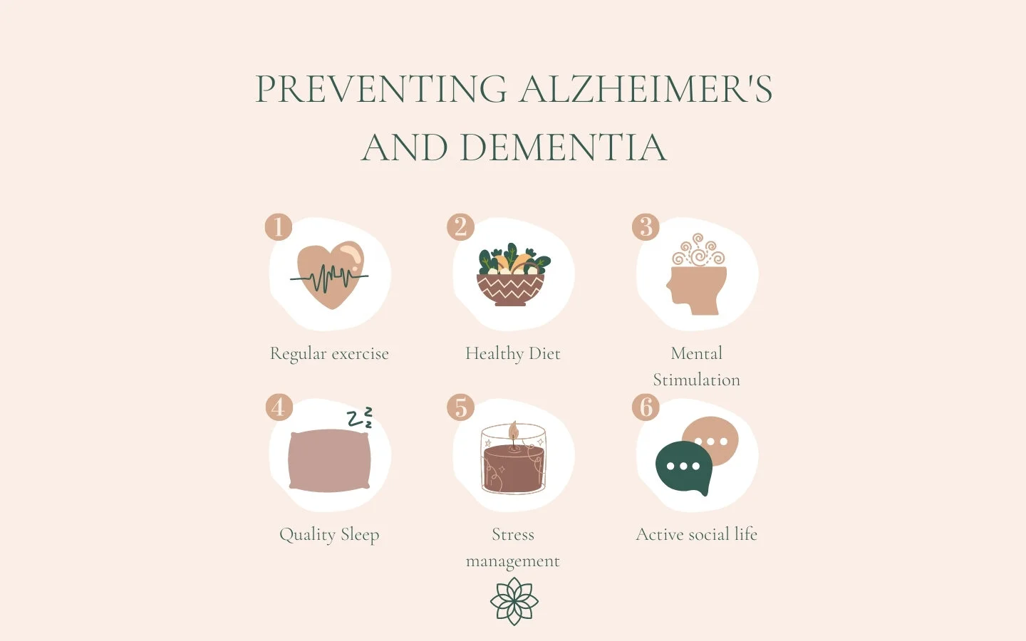 Without adequate sleep, we are not only cranky and unfocused, but we impair our ability to store and recall information. This puts you at a greater likelihood of developing symptoms of Alzheimer’s and dementia later on. Aim for 7-8 hours of deep sleep per night, which is also critical for memory formation and retention. Establishing a regular sleep schedule by going to bed and getting up at the same time also helps to ensure you stay on track.